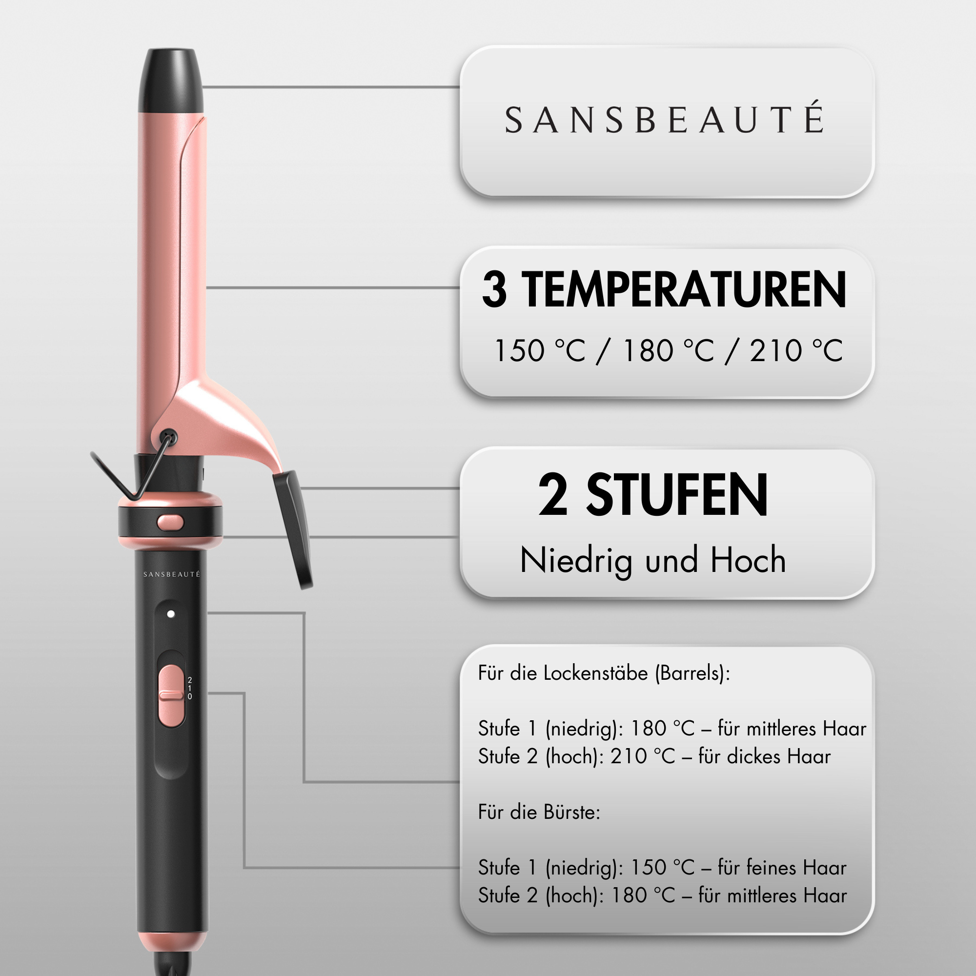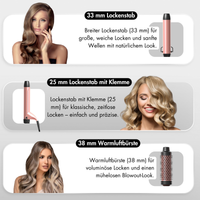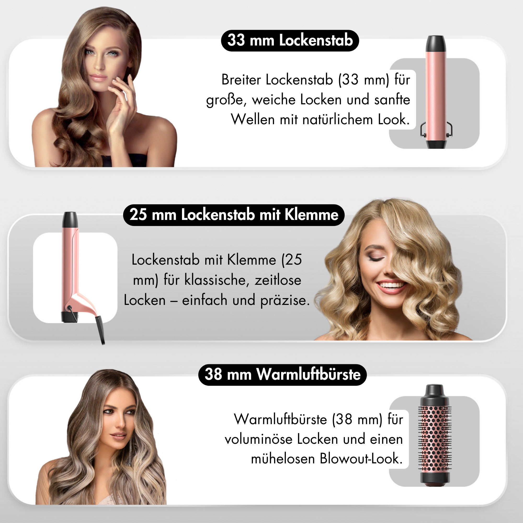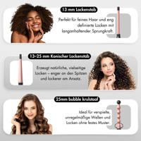 Von einer 13 mm starken Locke bis zu einer 38 mm starken Welle – jeder Aufsatz liefert sein eigenes, einzigartiges Ergebnis.