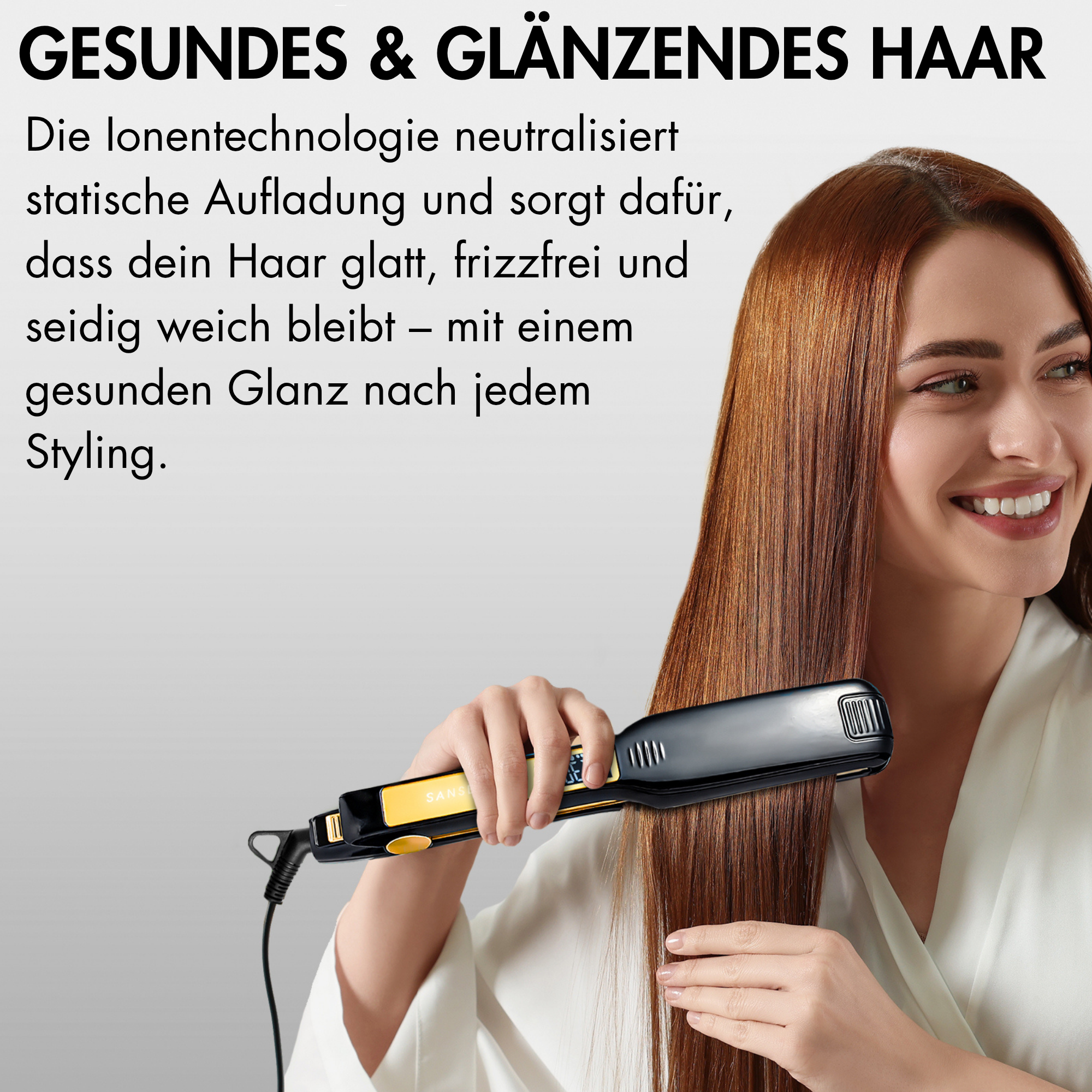 Ionen tragen dazu bei, die statische Aufladung des Haares zu reduzieren und sorgen für ein glänzendes und weiches Haargefühl.