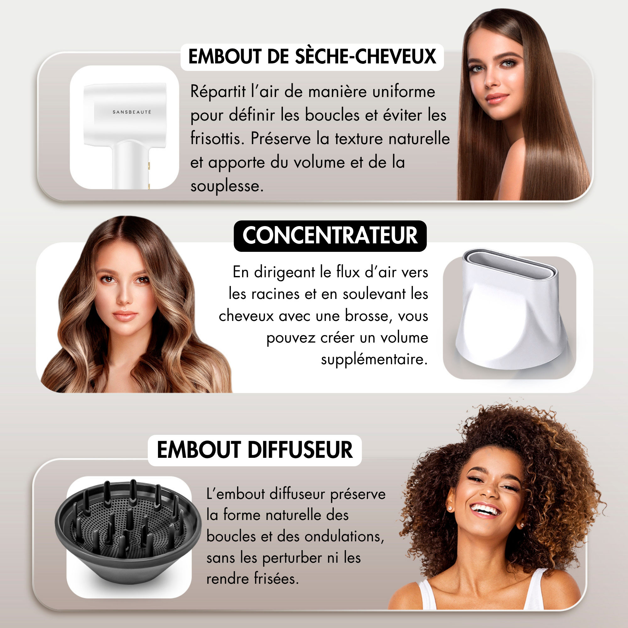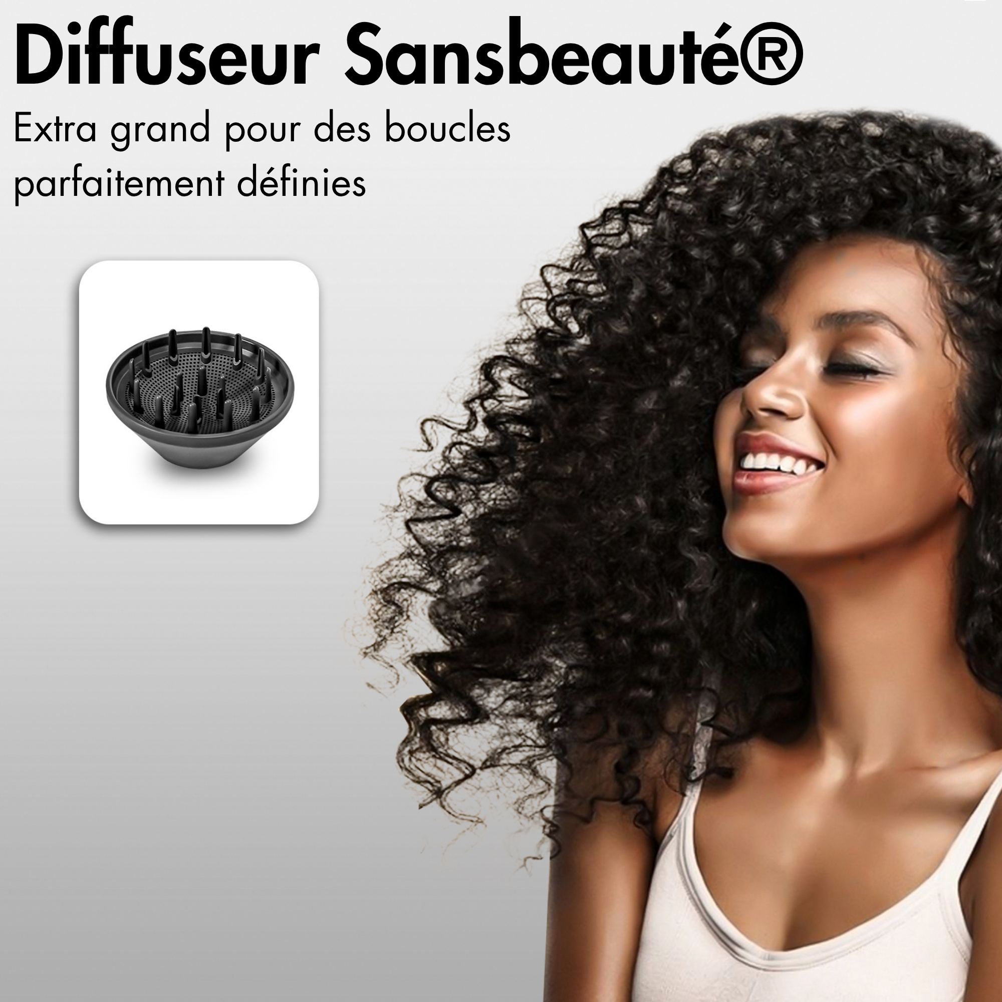 Le diffuseur répartit le flux d'air uniformément, permettant aux boucles et aux vagues de conserver leur ressort naturel sans frisottis ni dommages.