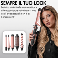De Sansbeaute® Krultang 6-in-1 è la tua soluzione completa: un unico strumento, sei accessori e una tecnologia che protegge i tuoi capelli da danni inutili. Grazie al riscaldamento in Ceramica al Tormalina e PTC ottieni rapidamente capelli magnificamente acconciati che mantengono la forma più a lungo – con meno crespo, meno picchi di calore e più lucentezza.