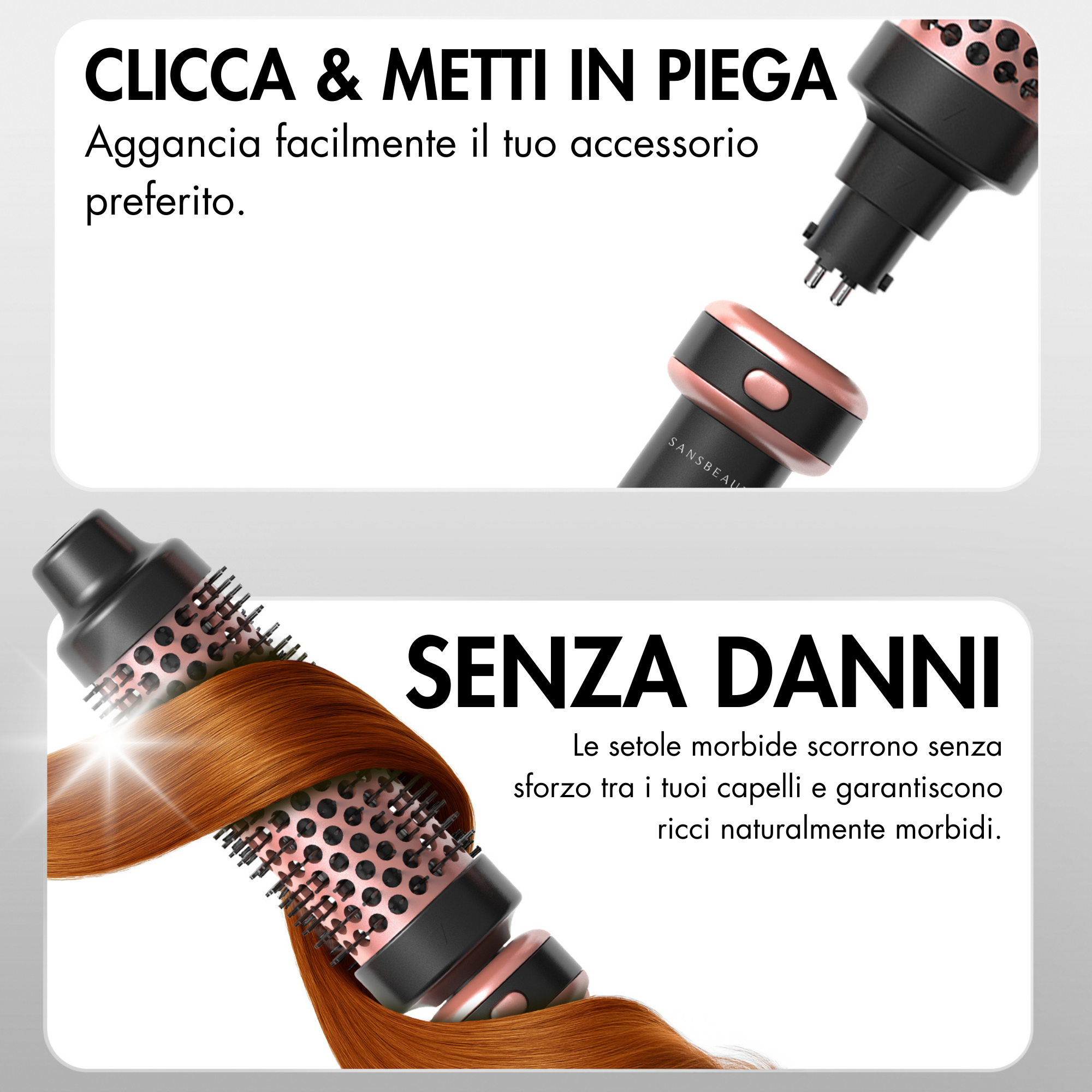 Una spazzola asciugacapelli, un ferro arricciacapelli stretto, uno largo… prima che tu te ne accorga il cassetto del bagno è pieno di strumenti costosi. Con Sansbeaute® ti basta un solo apparecchio: sei accessori in un unico set, facile da portare nella custodia inclusa.