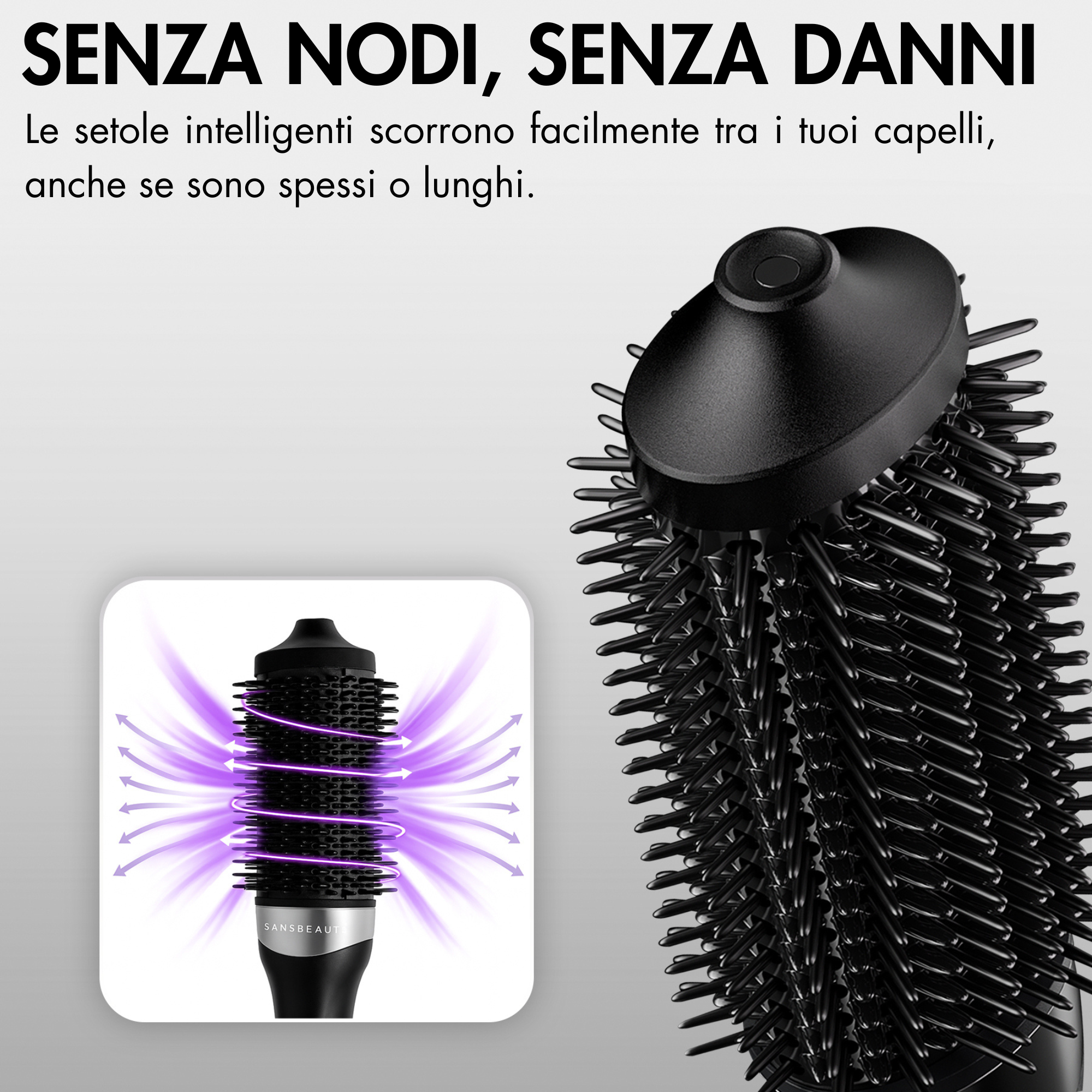 Cerchi una spazzola asciugacapelli che velocizzi la tua routine di cura dei capelli, dia volume e un risultato senza crespo – senza danni? La spazzola asciugacapelli Sansbeaute® è la soluzione 3-in-1 per chiunque voglia passare rapidamente e senza sforzo dai capelli tamponati a un look da salone. Grazie alla combinazione intelligente di aria calda, una testa ovale e setole anti-nodi, questo strumento asciuga, spazzola e acconcia i tuoi capelli in un solo gesto. Niente più problemi con asciugacapelli e spazzola rotonda separati, niente surriscaldamento, niente crespo. Solo capelli sani e lucenti che mantengono la forma tutto il giorno – anche quando sei di fretta. Che tu abbia capelli fini, spessi, ricci o crespi: questa spazzola asciugacapelli si adatta e offre risultati visibili fin dal primo utilizzo.