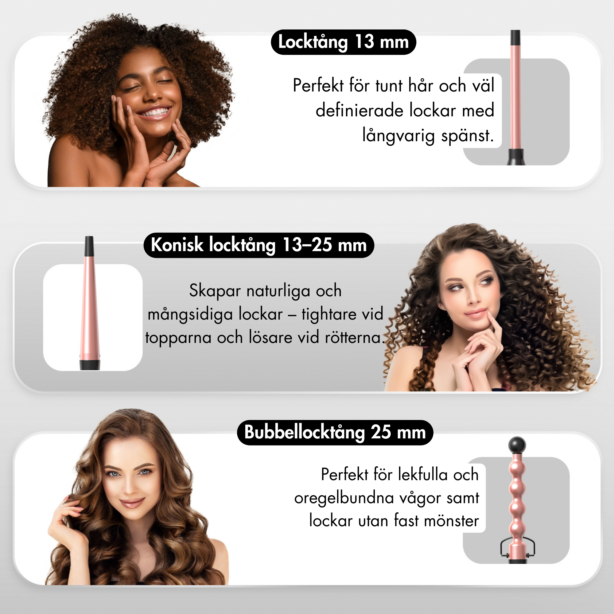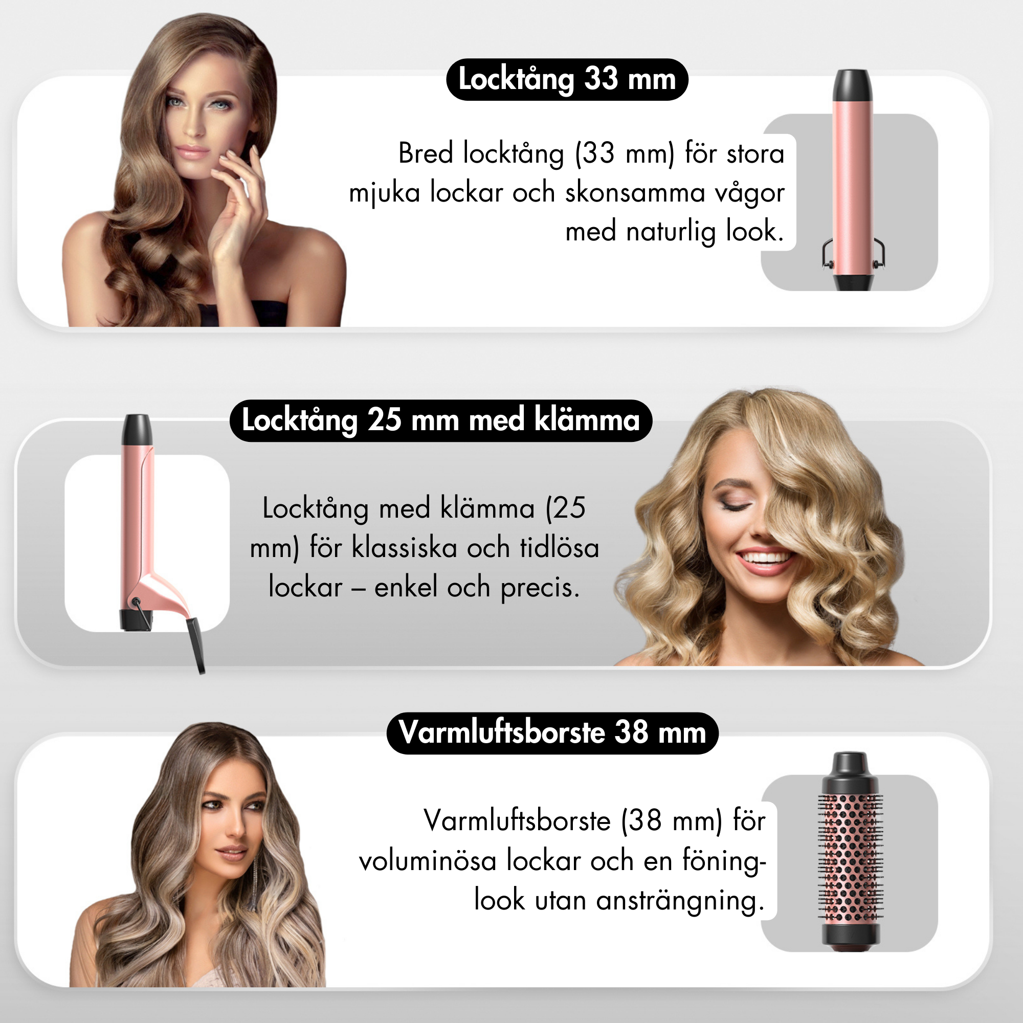 - 6 tillbehör för varje önskad look – Från tajta lockar till beachy waves, enkelt och smidigt att styla.