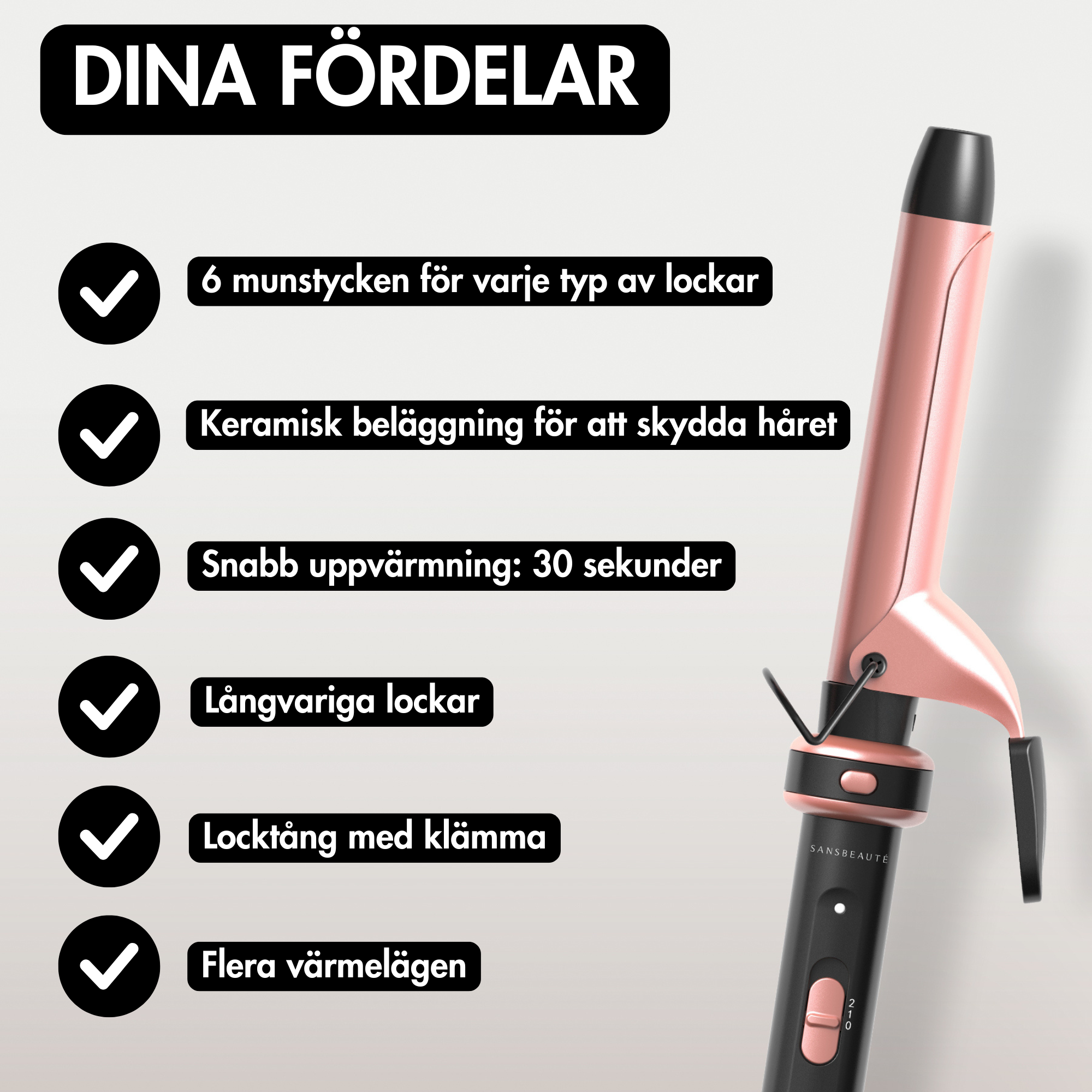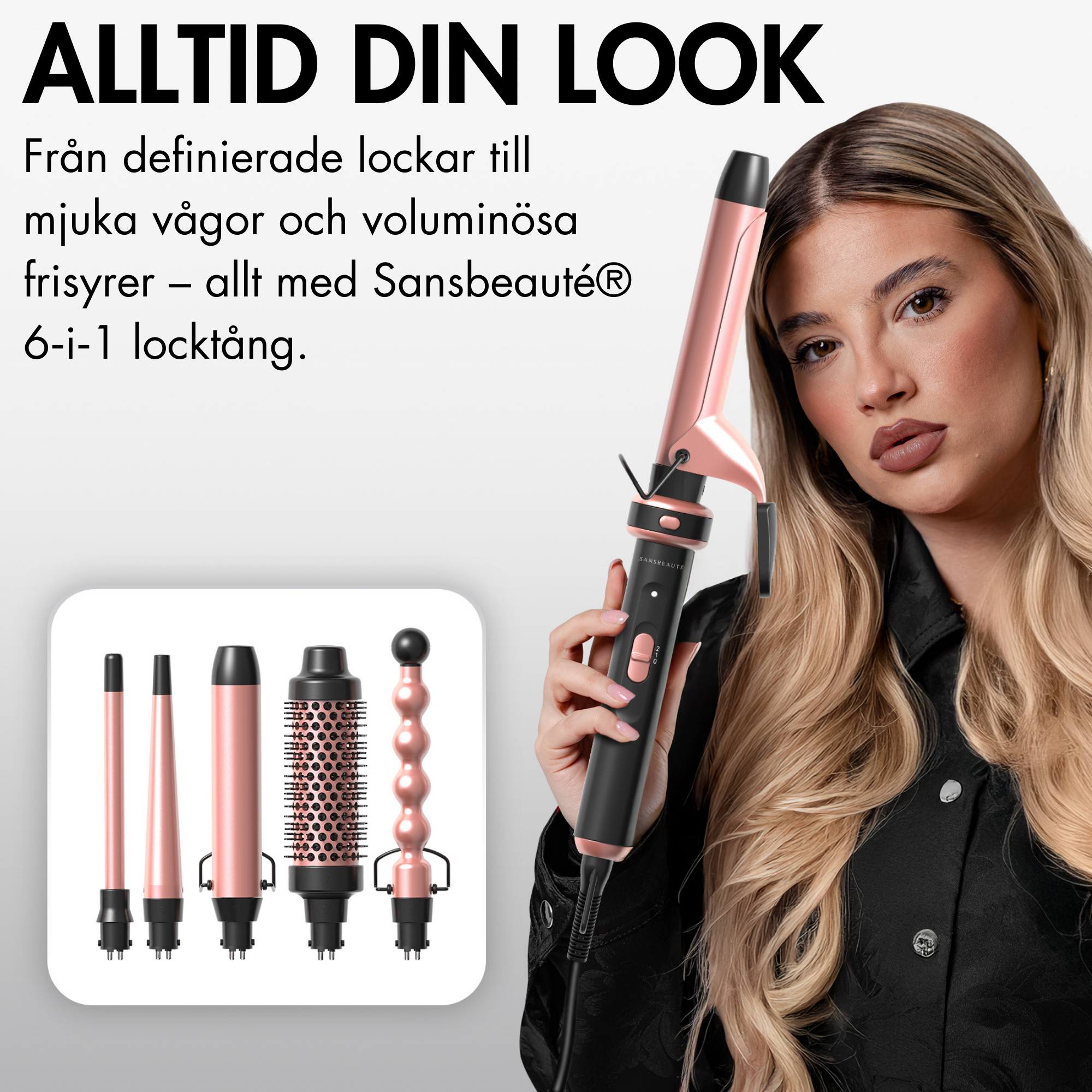De Sansbeaute® 6-i-1 Locktång är din kompletta lösning: ett verktyg, sex tillbehör och teknik som skyddar ditt hår från onödig skada. Tack vare Tourmaline Ceramic & PTC-värme får du snabbt vackert stylat hår som håller formen längre – med mindre friss, färre värmetoppar och mer glans.