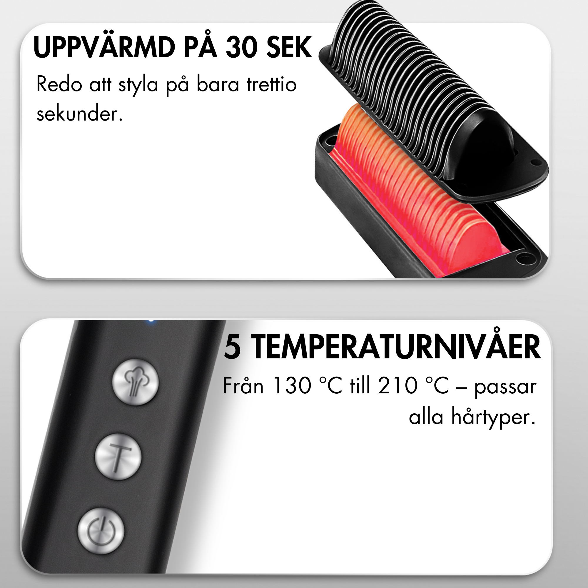 - Temperatur för alla hårtyper – 3 lägen: 160°C (tunt/fint hår), 180°C (normalt/lockigt hår) och 200°C (tjockt/grov hår). Alltid rätt temperatur för ditt hår.
