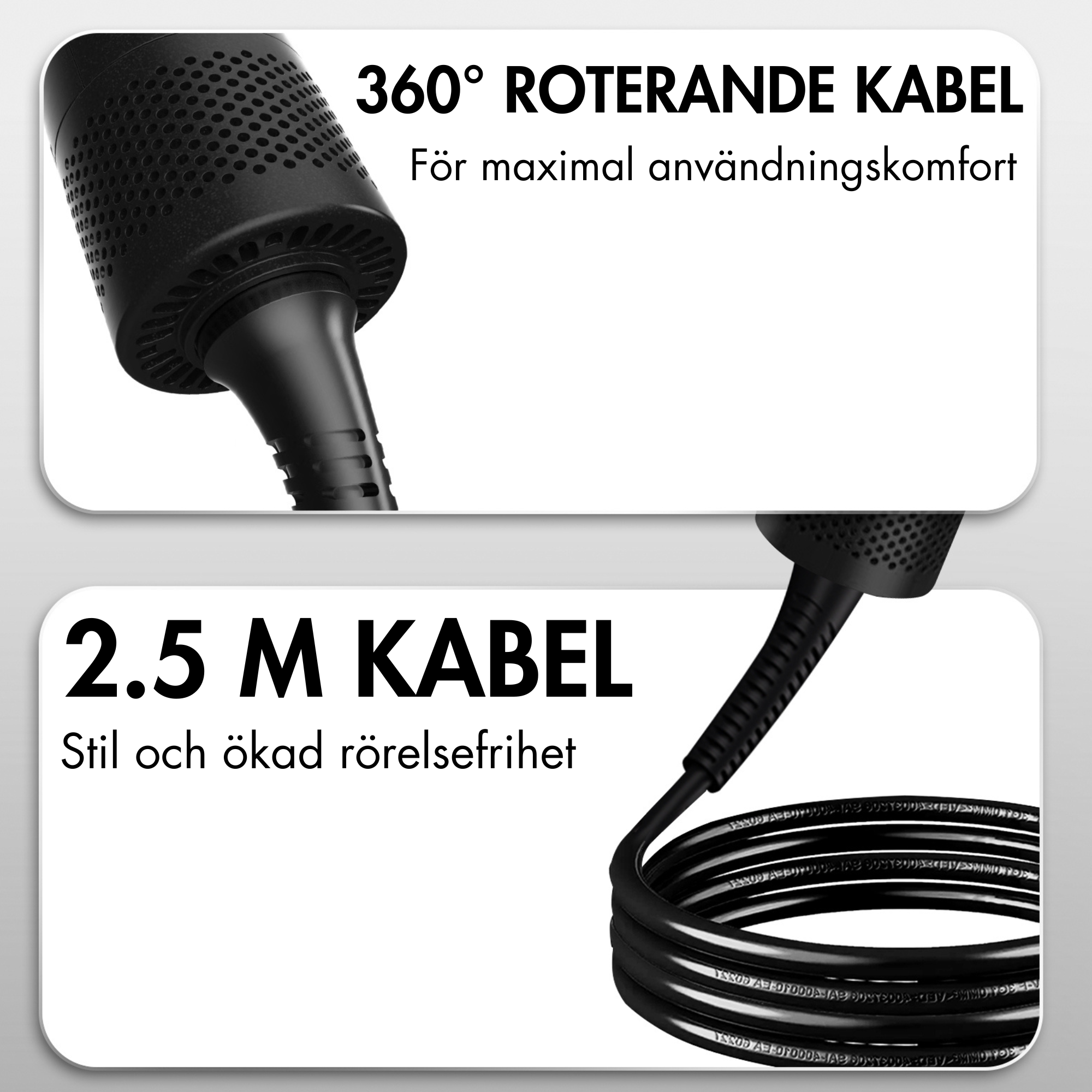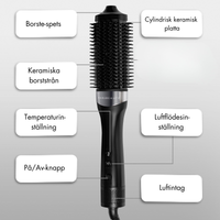 - Ovalt borsthuvud med keramisk beläggning – Skapar volym, vågor eller släthet utan flera verktyg.